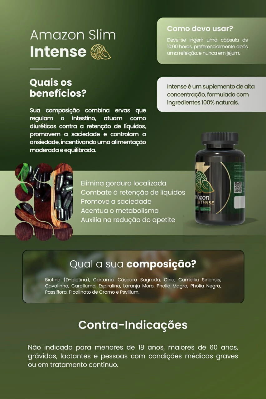 AMAZON INTENSE (30 cápsulas): Este suplemento atua acelerando o metabolismo e inibindo o apetite. Com fórmula natural, ele diminui o inchaço abdominal, auxilia no controle da glicemia e colesterol, além de aumentar a sensação de saciedade, sendo ideal para sua reeducação alimentar.